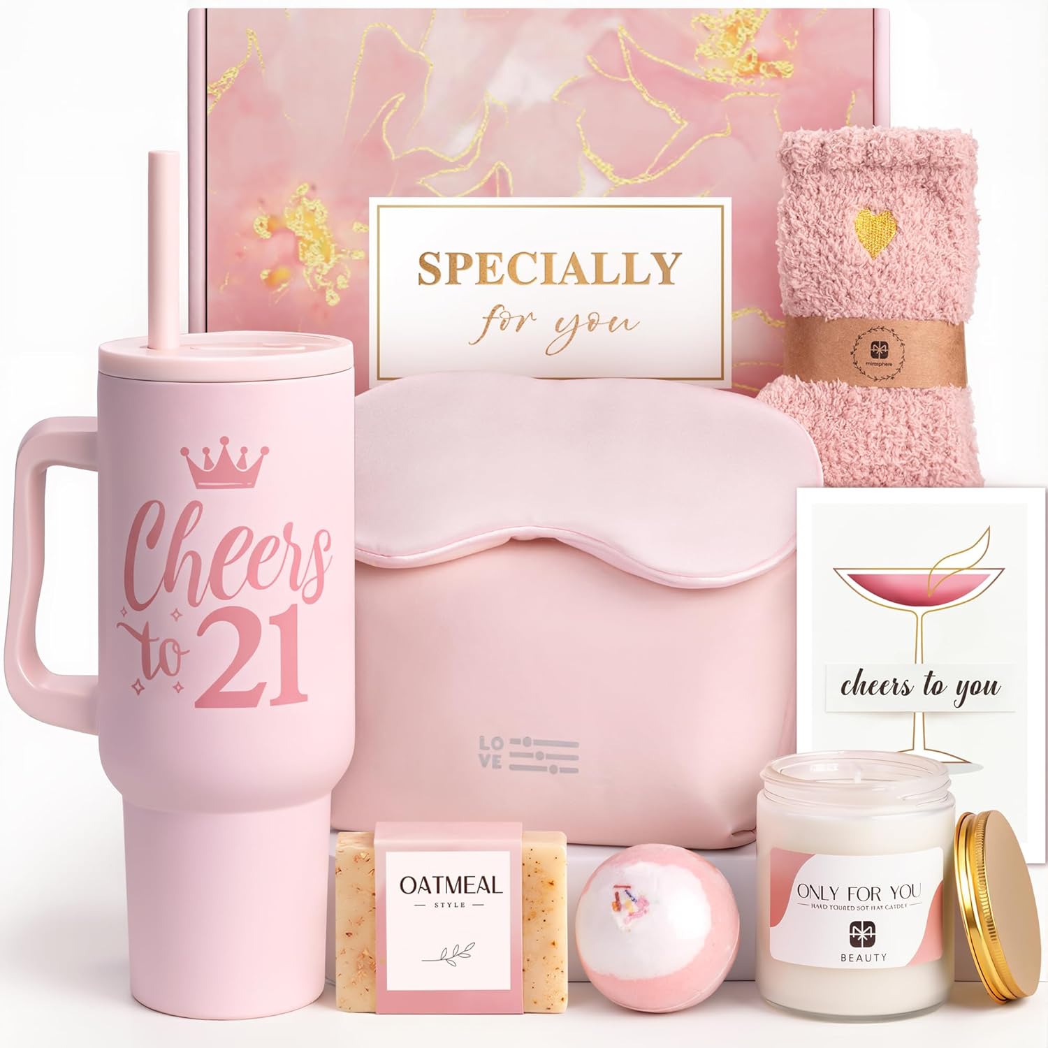 11 pieces Unique Girl Birthday Gift Ideas: Packed with 11 thoughtfully selected pieces,24oz pink insulated tumbler with straw,natural stone bracelet,lavender scented Candle,rose-gold mirror,cute cosmetic bag,bath salt balls,birthday poster,pink socks,hair band,bobby pin,and birthday card.