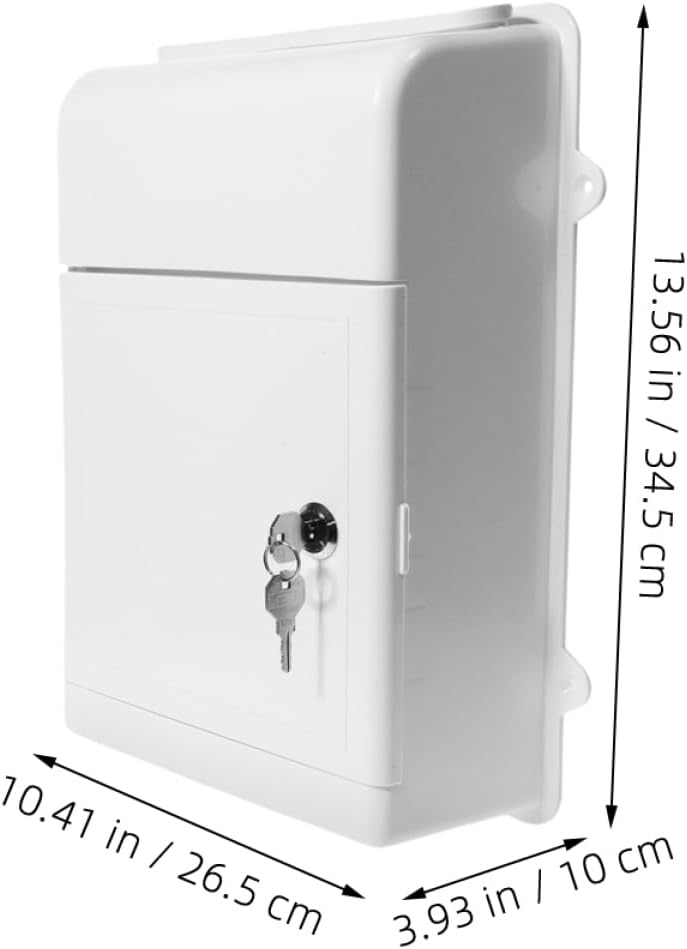 Package Include 2 set Mailbox (2pcs mailbox , 4pcs keys ) Characteristics -Large capacity: provides ample space to store multiple letters wall mounted boxes -Rainproof design: made with rainproof materials to ensure letters are protected from water damage security mailbox -Color:White donation boxes for fundraising -Material:Plastic, Metal donation boxes for charity -Size:34.50X26.50X10.00cm/13.56X10.41X3.93in office mailbox -Aesthetic and practical: white exterior design that is simple and elegant classroom mailbox -Easy installation: wall mounted installation for quick and convenient setup wall mounted mailbox -Multifunctional design: suitable for offices, communities, and other locations, for collecting suggestions and complaint letters mailbox for outdoorGoods Descriptionclassroom mailbox The mailbox is easy to install and ensures that your important documents remain .wall mounted mailbox This wall-mounted mailbox is designed to be simple yet functional, providing a secure and weather-resistant way for collecting mail, suggestions, and complaints.mailbox for office Its sleek design makes it suitable for various environments, including offices, residential areas, and classrooms
