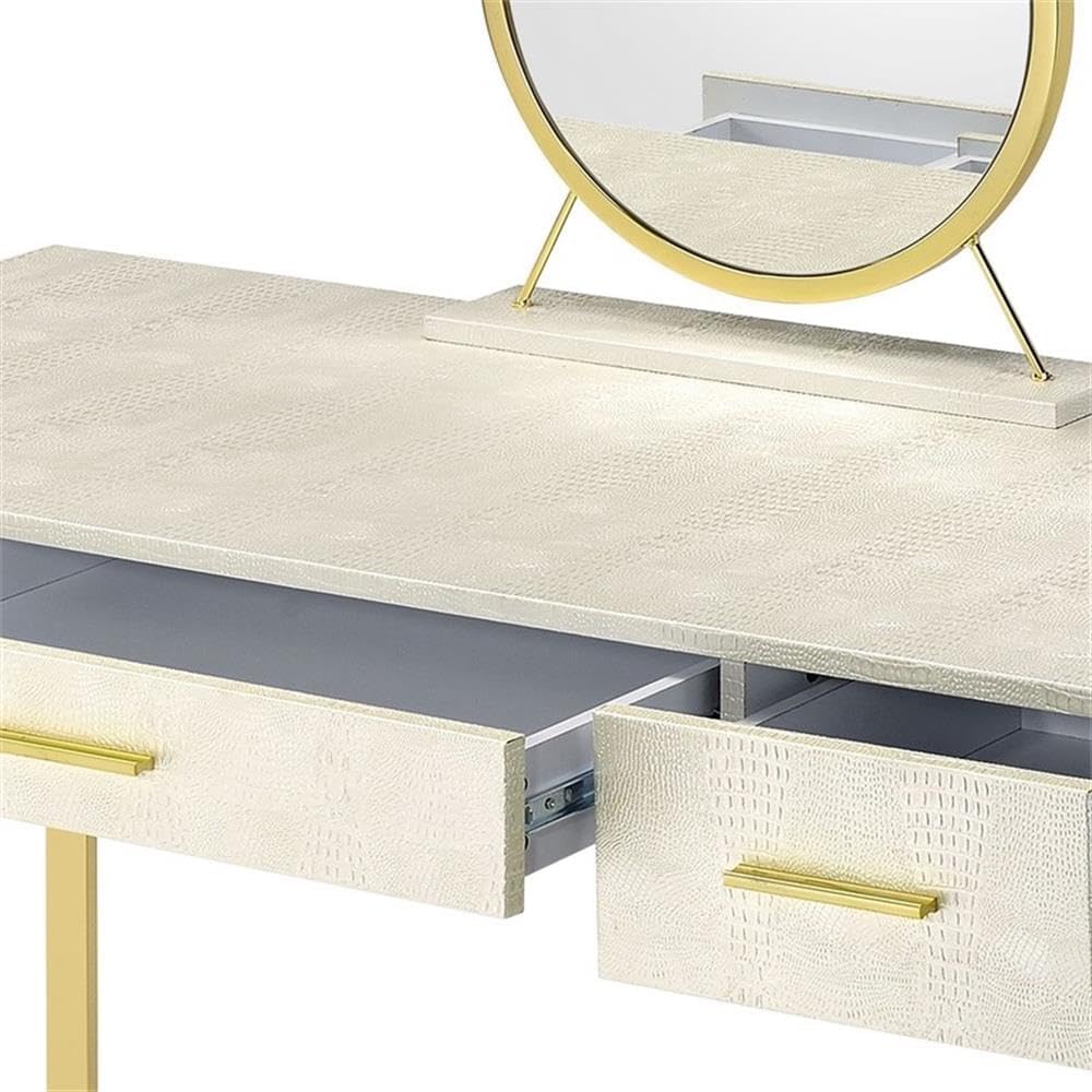 Make getting ready for a night out on the town fun with the white vanity desk. From the beautifully faux crock textured case to the sturdy shiny champagne base make this a statement piece. The three ample drawers have enough room for beauty tools and supplies. The built-in outlet and USB ports will bring convenient.