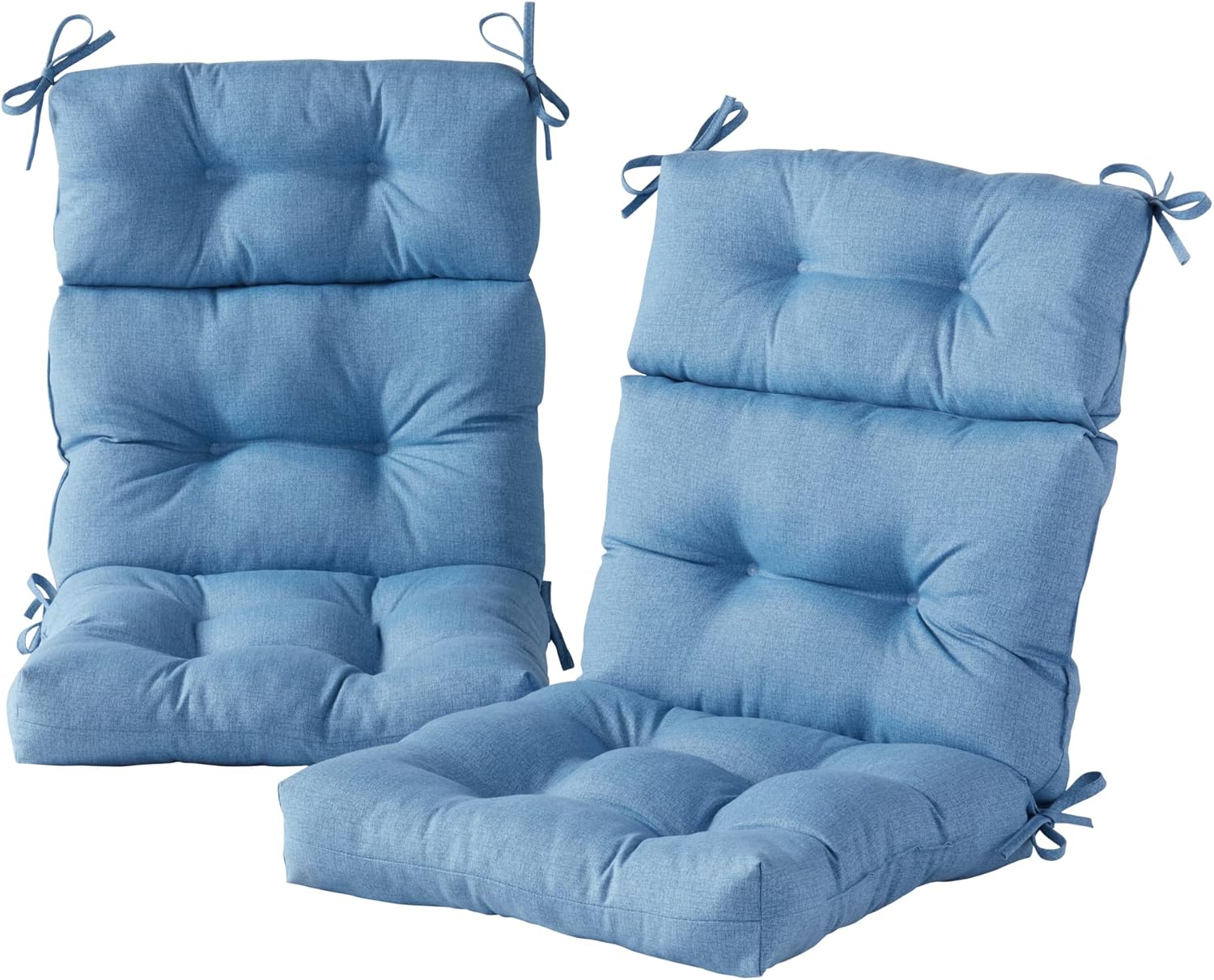 Enhance the look and feel of your patio furniture with this Greendale Home Fashions Outdoor High Back Chair Cushion Set. These cushions measure 44" x 22" x 5", and come with four sets of string ties to keep cushions securely in place. Each cushion is overstuffed for extra comfort and durability with a soft polyfiber fill made from 100% recycled, post-consumer plastic bottles. Cushions are covered with a durable polyester outdoor fabric that holds up to the outdoor elements, so your cushions will look great season after season. A sewn circle tack construction helps prevent fill from shifting and bunching. A variety of colors and prints are available to enhance your outdoor decor. Cushion shell made in China, filled and finished in the USA. Spot clean as needed with mild diluted soap solution.Please Note: Cushion dimensions can be +/- 2 inches. Product will arrive in a slightly compressed state; please allow a few days for product to expand to final size listed in description.In an effort to reduce waste, your cushions will arrive in a recyclable box with no additional plastic waste.For best results, and to extend the life of your cushions we recommend storing them covered when not in use.