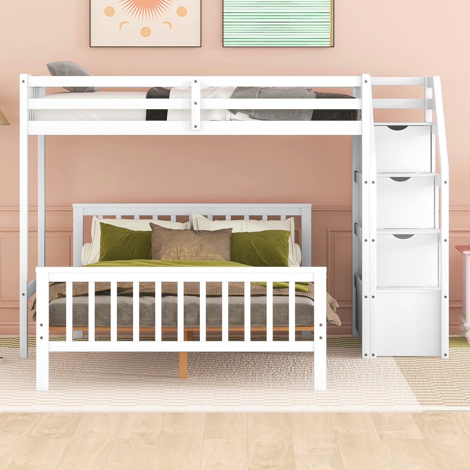 This twin over full bunk bed anchors your room in timeless style. Crafted from solid pine wood and MDF, this twin over full bunk bed showcases slatted head and footboards, clean-lined guard rails, and a built-in ladder.Utilizing every space within the bed’s structure, a fully assembled three-drawers and built-in desk are built into the side to give you tons of storage opportunity.It can also be divided into two independent beds for even more convenience. Description Bed Material: Pine Wood+MDF Size: Twin over Full Color: White/Gray/Natural Numbers of Package: 2 Assembly Required: Yes Origin: Vietnam Dimensions Overall Product Dimension: 77''L*77.5''W*64''H Loft Bed Dimension: 75.5''x 38'' Platform Bed Dimension: 75.5''x 54.3'' Total Height: 64'' Number of Each Bed Slats: 14/14pcs Overall Product Weight: 180lb Upper/bottom Bed Weight Capability: 250/400lb Upper/bottom Bed Mattress Thickness: 6''/8-10''