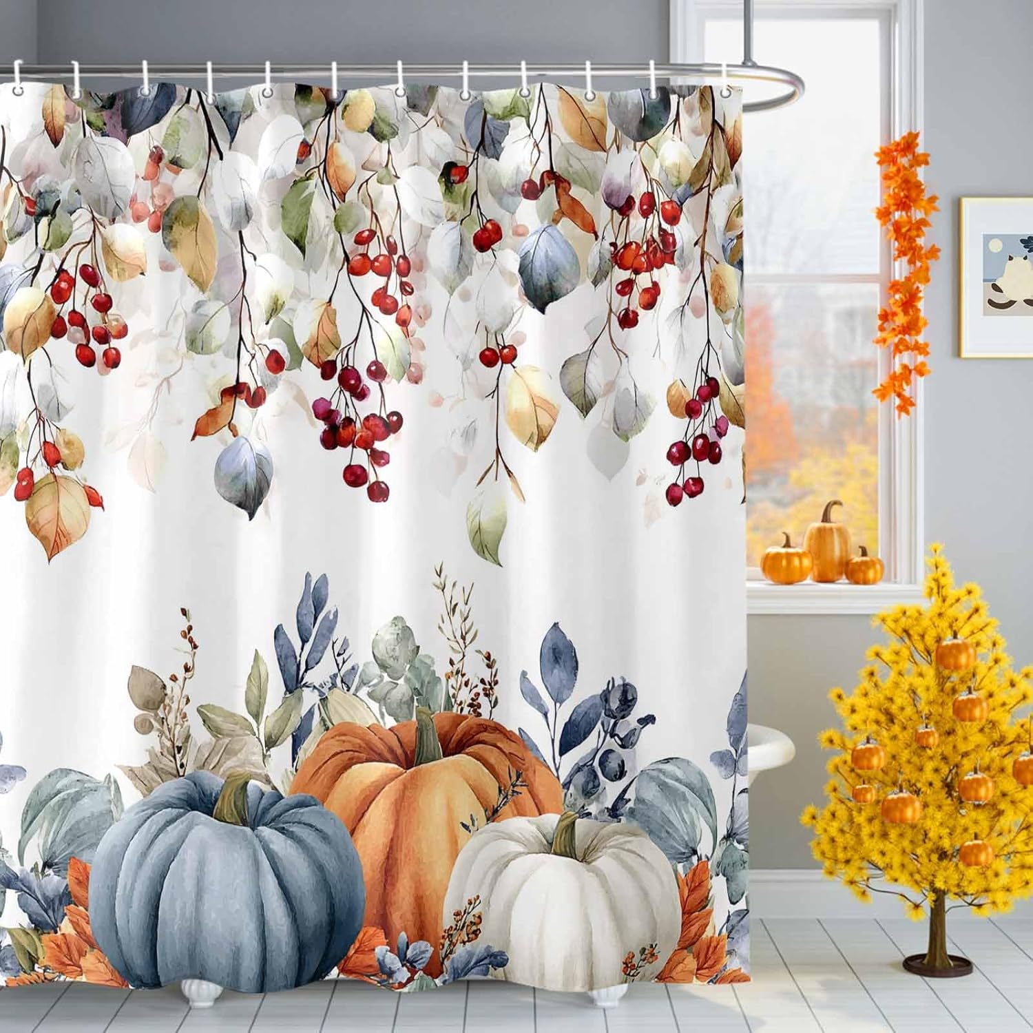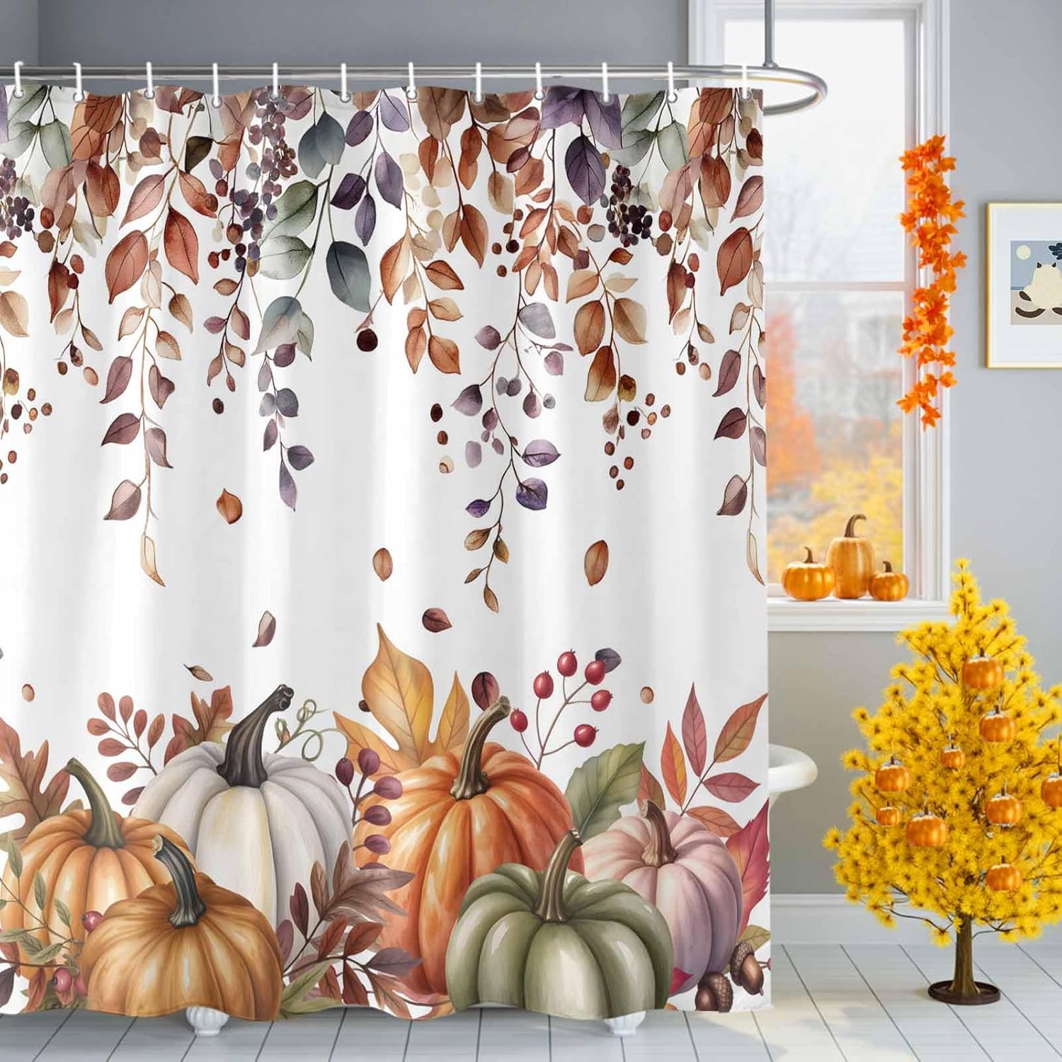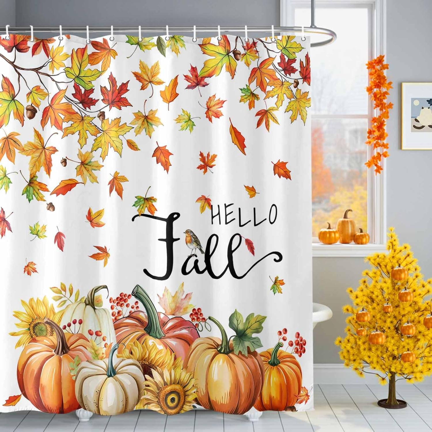 Buying a fall shower curtain can refresh your bathroom and bring some personal flair to a space that can be quite dull.Premium Quality- fall shower curtain is composed of polyester fabric.- Breathable and fast drying.- Stall fall shower curtain fabric is smooth and drapes well.Good Performance1.Extra long fall shower curtains help your bathing life as a shield to avoid water from splashing out of your shower or bathtub.2.The water-repellent and smooth fabric of rustic fall shower curtains can bead up quickly and dry quickly.3.The material of the modern fall shower curtain is thicker and the sewing at the bottom is heavier, which ensures that the fall shower curtain for bathroom is not easy to flutter during use.4.There will be 12 plastic C-rings in the funny bathroom fall shower curtain package, easy to hang, fits standard curved or straight rods on the market.5.There are 12 metal grommets on the top of the farmhouse fall shower curtain, which are precisely sewn with the fall shower curtain and will not crack and rust.6.It can be used as a stand alone fall shower curtain or as a liner to coordinate with your decorative bath curtain.7.Bathroom fall shower curtains can be used as gifts for parents and friends for Christmas, St. Patrick's Day, Easter, Independence Day and more.Easy To Maintain- Use a towel to wipe the water off the surface of the fall shower curtain for bathroom.- Machine washable in cold water for deep cleaning.- Please do not bleach it.