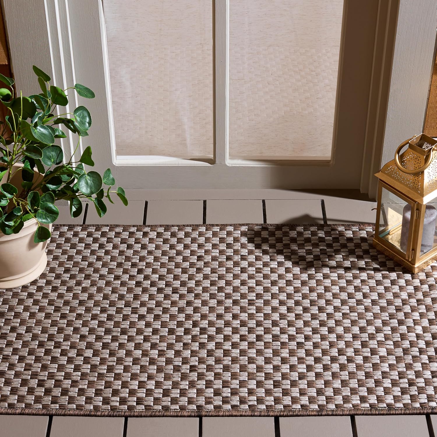 Safavieh's Courtyard Collection is inspired by timeless designs crafted with the softest polypropylene available. This rug is crafted using a power loomed construction and features a main accent color of natural. Perfect for any backyard, patio, deck or poolside, this rug will instantly turn your outdoor area into a resort-style entertaining space. Finely crafted for seasons in the sun and years of open-air gatherings, the Courtyard rug instantly elevates any interior or exterior décor to a space of visual inspiration. More than a decorative enhancement, this rug is both and - to ensure carefree maintenance. With its style, practicality, and transitional decorating options, this rug extends an open invitation to gather and may just spark impromptu parties. Primary Color: AquaPile Height: 0.25 inches Material: Polypropylene Style: Contemporary Construction: power loomed Rug Type: Indoor/Outdoor Feature: Latex Free Rug Dimensions: 8' x 11'.