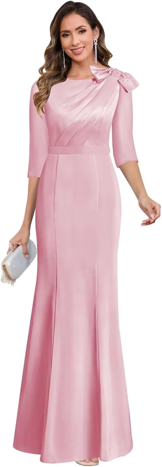 Features: Quorivae Satin Mother of The Bride Dresses Long Sleeve Mermaid Pleated Formal Gown with Bow. Fabric:Satin Silhouette:Mermaid Back:Zipper Back Size Selection: Please follow the measure chart, provide your measurements as follows: 1. Bust___inches 2.Waist___inches 3.Hips___inches 4.Hollow to floor ___inches 5.Natural Height(without shoes)___inches 6.Heels Height___ inches 7.The date you need the dress:____