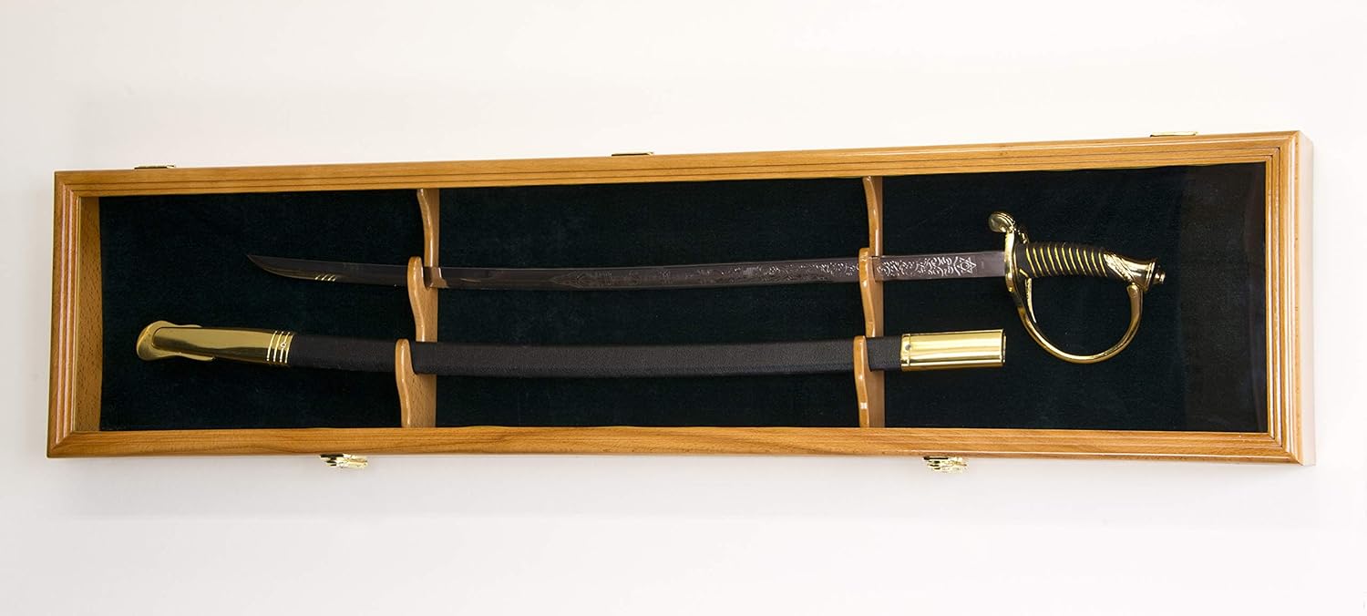 Hand made from imported Australian beech wood. This furniture grade display case is of beautiful design and construction, very detailed and attractive, but also very affordable. This 1 Sword and Scabbard display case comes standard with a 98% UV Protection Door. A red/black/green/blue/white felt background provides a stunning contrast for your item. Display case comes standard with heavy duty lockable latches with keys, brass hinges, and installed wall hanging brackets. Perfect for displaying a US Army Officer Saber, US Army NCO Saber, Japanese Samurai Swords, Civil War Swords, etc etc. Move-able matching sword stand included. Truly a must have to secure and protect your sword Cabinet comes ready to be mounted to your wall. (sword shown not included). Unit Weight: 13 lbs. Dimensions: Outside: 45"W X 11"H X 4.00"D Inside: 44"W X 10"H X 3.5"D Important note: Please make sure your sword and scabbard are within the inside measurements of this case before purchasing.