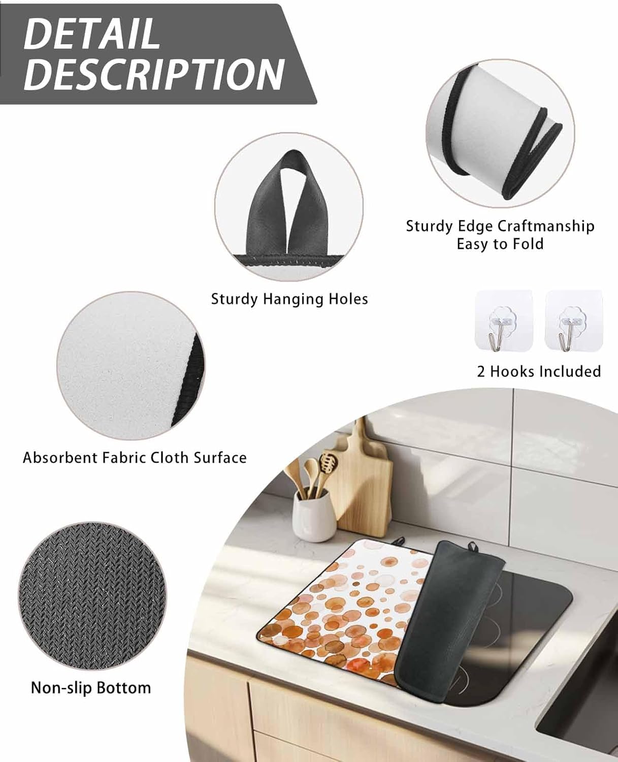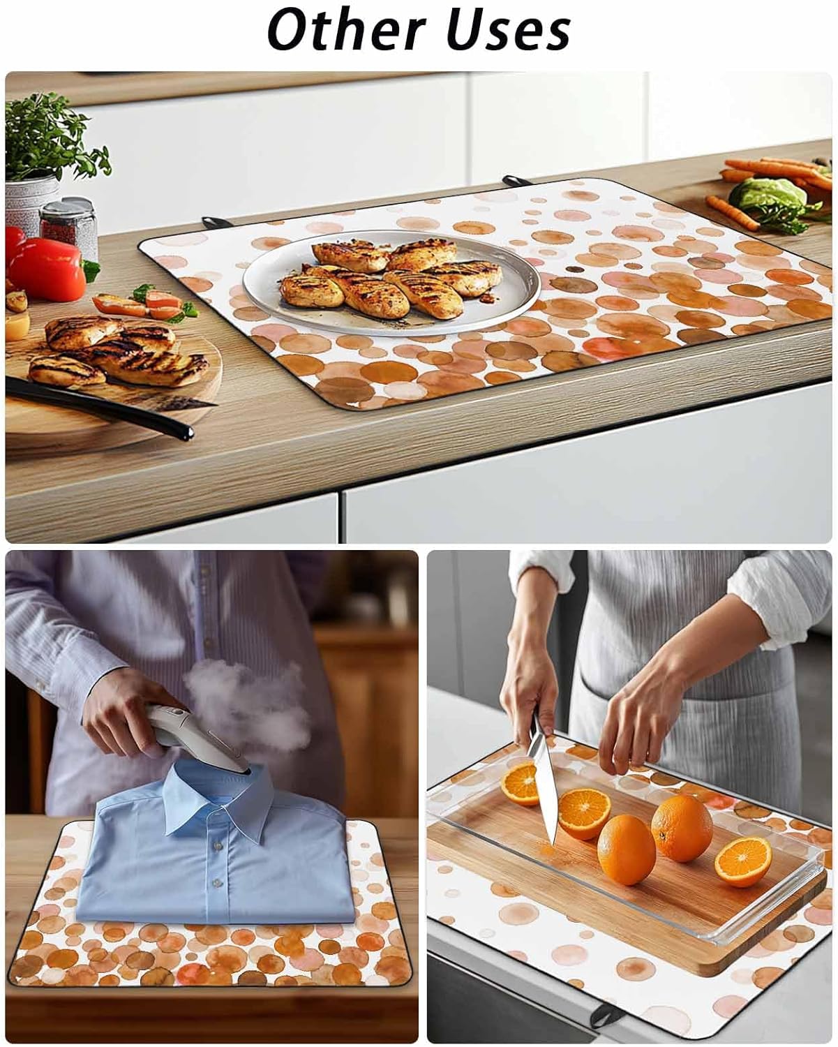 Stove Top Covers combine practicality and beauty, adding more color to your kitchen decorations.Product DescriptionMaterial: 100% Polyester cloth fabric surface with natural rubber backingSize Chart: 28.5x20.5 Inch / 24x21 Inch / 31x24 Inch / 36x21 InchExquisite WorkmanshipThe top is a layer of high-quality 100% Polyester and the bottom is rubber, which is waterproof, non slip, foldable and reusable. Will not move around when you prepare food on it.Counter Top ProtectorProtects electric, glass, or ceramic stovetop from scratches, scrapes, glass cracks, dirt & spills.Versatile UsesThe mat can be used as a stove top cover, counter top mat, ironing mat, washer top cover, coffee mat, flat top oven cover, dryer top cover, oven cover, refrigerator top cover, extra large rubber mat.Extra Counter SpaceThis stovetop cover is a one-stop solution for your many uses. It provides more worktop space for anything from food preparation to ironing. Therefore, this cooktop cover mat is perfect for kitchens with limited space.Ideal GiftThe exquisite pattern design makes the stove cover a perfect gift given to family friends and lovers. It adds color to your kitchen docor.Foldable and Easy StorageOur stove cover can be folded or rolled up and put away in your cabinet or cupboard when not in use.Special NoteNote: The mat may have creases from folding during shipping. This will smooth out in a couple of days.The colors may have slight differences due to different screens.