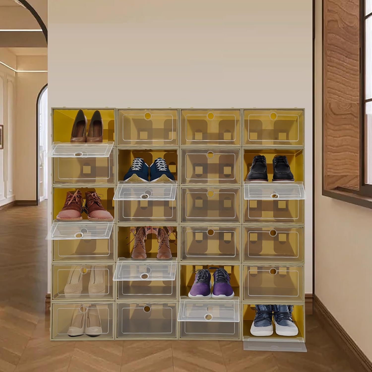 DescriptionThis stackable 24-piece shoe box set provides a neat shoe storage solution for your daily life. Each comes with a transparent flip lid that can save you time in finding shoes. The snap connection ensures simple installation while improving the stability of stacking and allowing you to combine them according to your living spaces, making shoe storage more convenient and efficient.DetailsSmooth Edges: They can protect your hands from getting scratched during installation and daily e.Clear Flip Lid: The items inside will remain clean. The clear design allows you to see the shoes inside at a glance so that you can quickly find the pair of shoes you want to wear. The round hole in the lid allows you to open the shoe box conveniently.SpecificationsColor: Avocado GreenHole Shape: RoundMaterial: PP, HIPSProcess: Injection Mold, Extrion MoldingMount Type: Free StandingAssembly Required: YesApplicable Shoe's Type: Flat Shoes(Within 44(Chinese Size)), Sports Shoes(Within 37(Chinese Size))Product Size: 33*23*14cm/12.99*9.06*5.51inPackage Size: 47*37*12.5cm/18.5*14.57*4.92inGross Weight: 4.9kg/10.8lbsNet Weight: 4.5kg/9.92lbsPackage Included24* Shoe Boxes1* English ManualNotes1. Please check the size carefully before ordering. Shoes are not included in this package.2. Please allow the slight color difference caed by the shooting light and 1-3cm error due to manual measurement, and make sure you do not mind before you order.