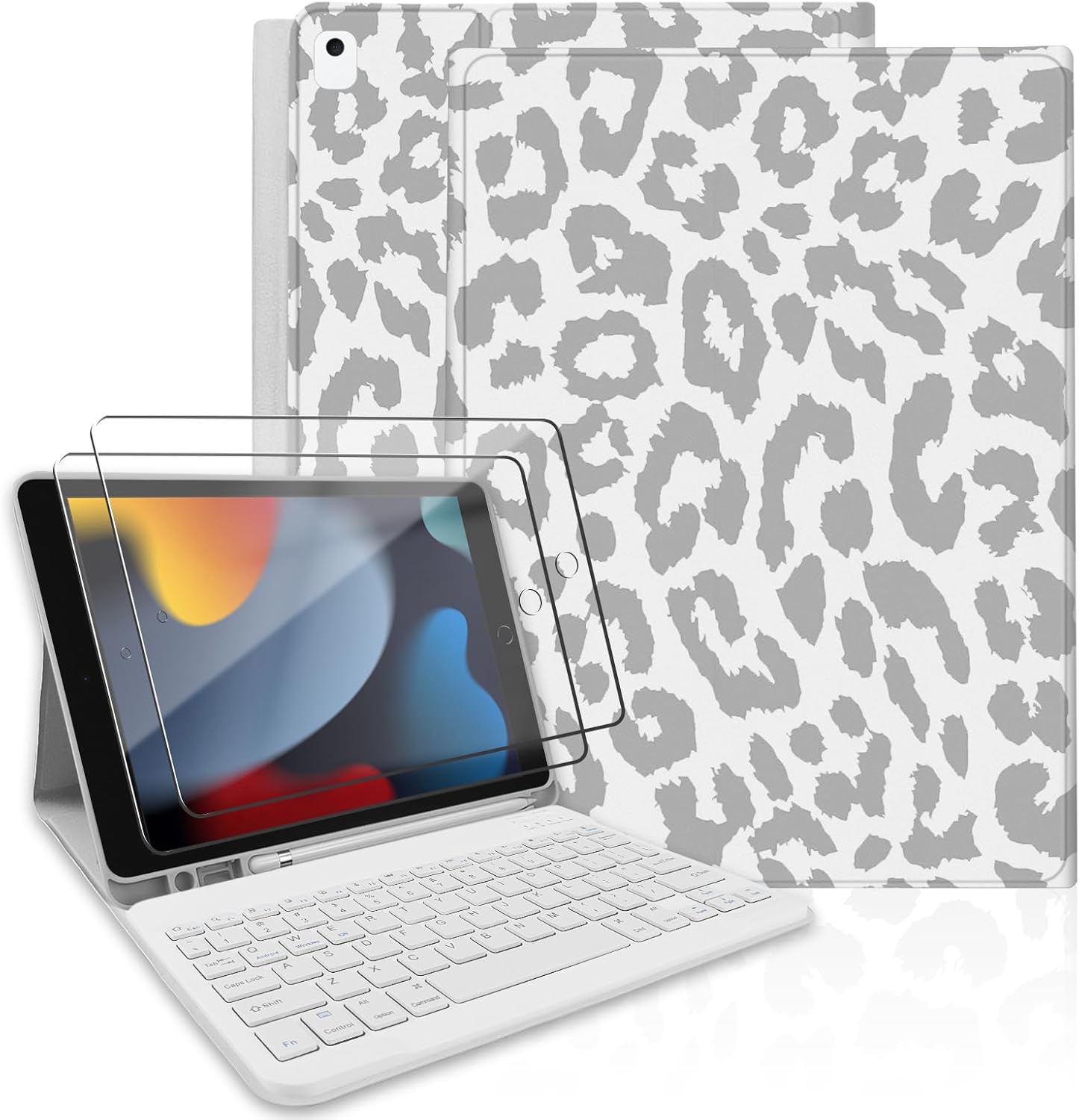 TopPerfekt for iPad 9th Generation Keyboard Case 10.2" 2021,Magnetically Absorbent,Auto Sleep/Wake,Pencil Holder with 2 Tempered Film for iPad 8th/7th Gen 10.2"/Air 3rd/pro 10.5"BookLeopardBlackgrey