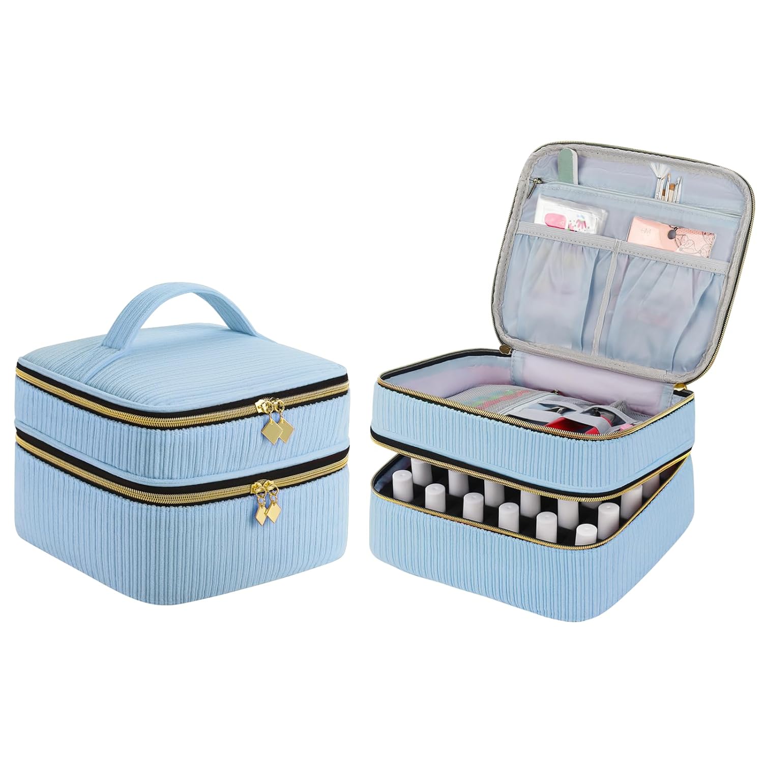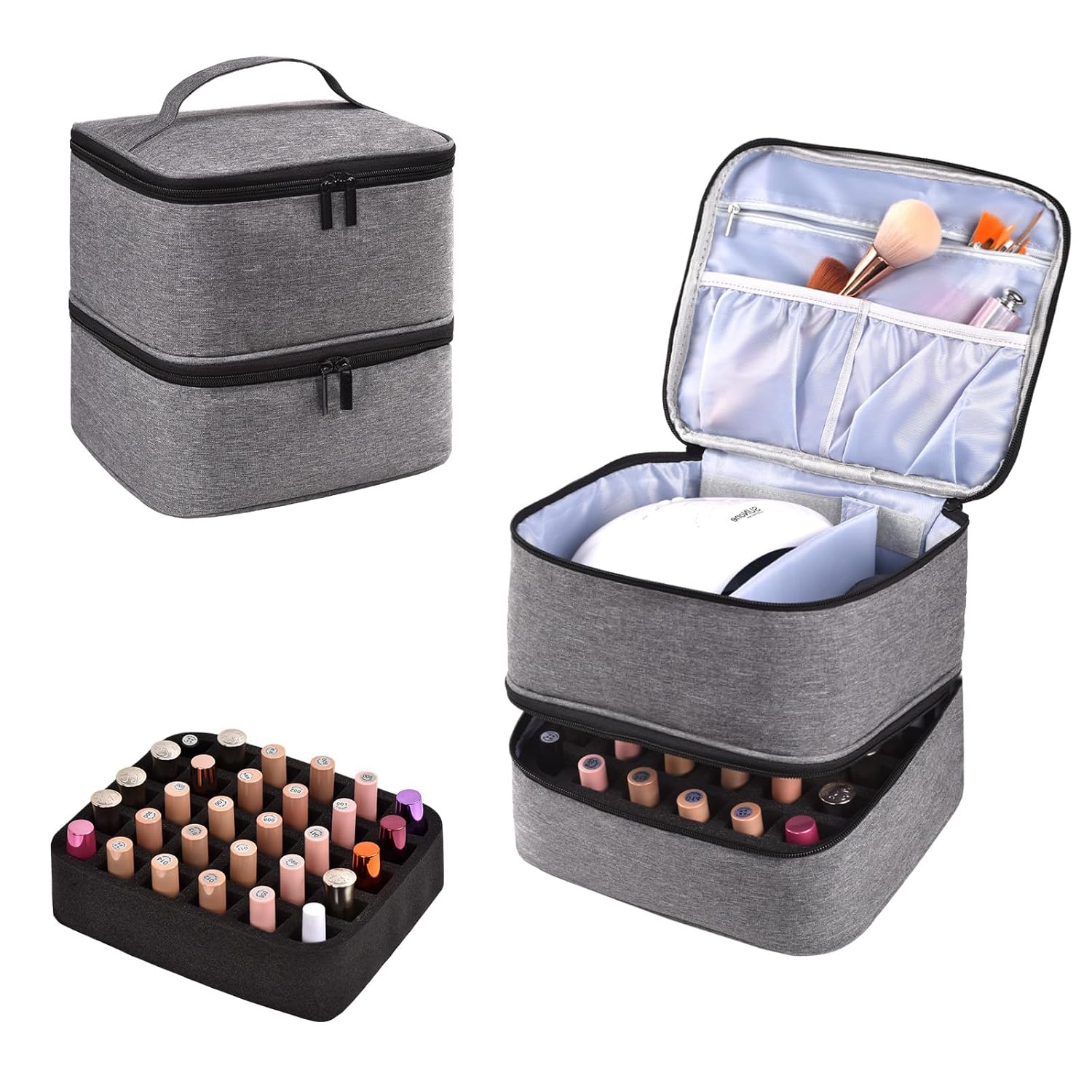 Perfect for at-home nail beginners! This nail case organizer keeps all nail supplies organized in one place, saving cabinet space for small rooms. This nail organizer will hold your lamp, your tips, your tools, your boards, your remover, and the bottom zips open to hold all of your bottles of polishes and oils. This nail case is convenient and compact, fitting perfectly in small storage spaces. Foam dividers for bottles are protective and sturdy. The top layer has plenty of space for supplies. The nail storage is durable for long-term use and perfect for your needs! This nail tech organizer and storage has large capacity, ideal for storing your nail lamp, files and accessories in the top layer, and base coats, top coats, nail glue and dehydrator in the bottom.