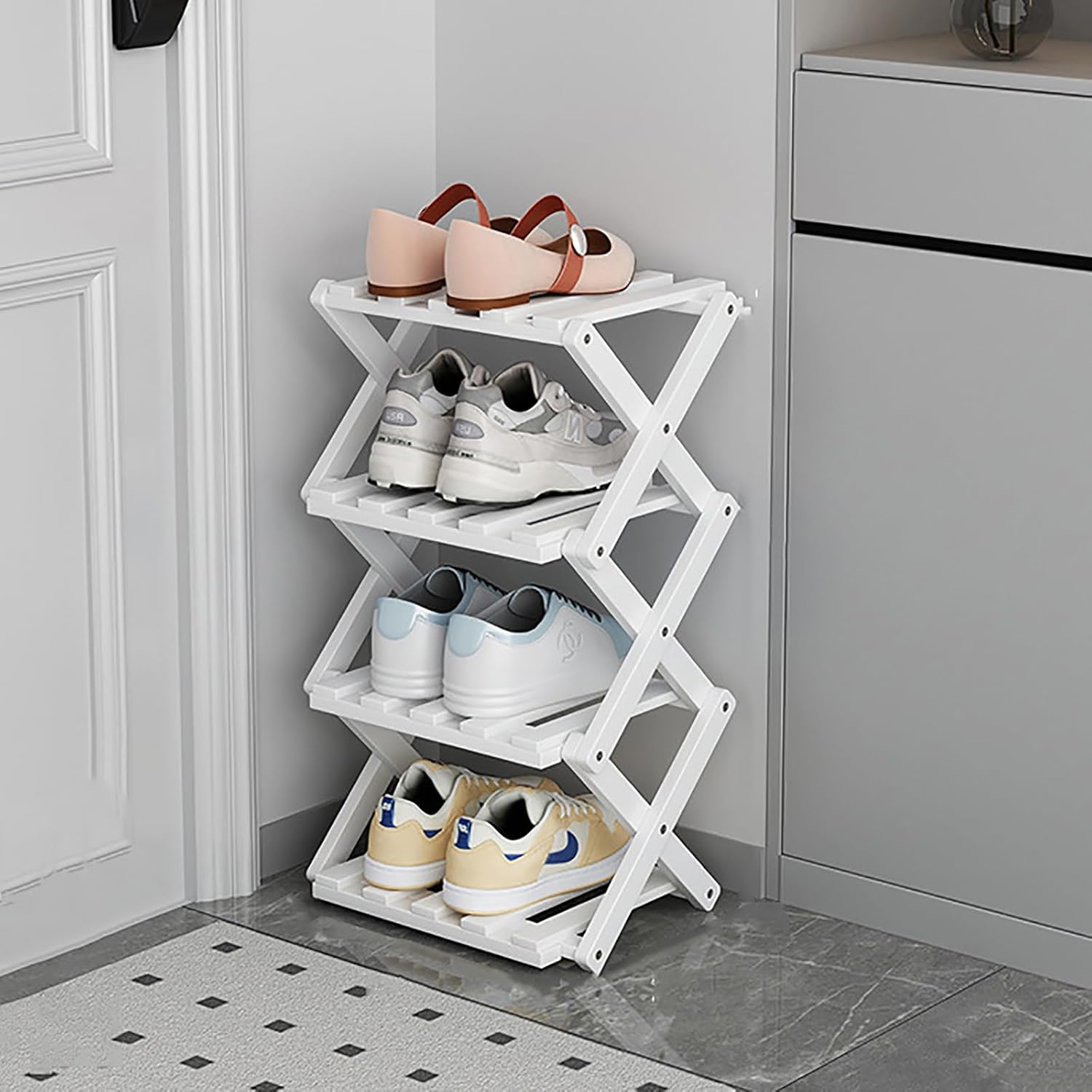 6 Tiers Shoe Rack,Vertical Narrowness Shoe Shelf ,Storage Rack,Space Saving,Tall Narrow Shoe Rack For Hallway And Corner.This shoe rack can meet your daily storage needs and facilitate your daily life.SPACE SAVINGOur shoe rack is perfect for small homes, its vertical design saves valuable space.VERSATILE USE In addition to storing shoes, it can also be used as a plant shelf or home organiser.FREE INSTALLATIONNo need to install, easy to fold and store, does not take up space.X-STABILISING BRACKETSX-shaped structure design, easy to fold, strong and stable.EXTRA WIDE BOARDSWider and thicked laminate, non-slip and anti-fall, made from bamboo, longer service life.NICE BREATHABILITYSpaced shelves, comfortable and breathable, tightly arranged, more convenient to place items.DIMENSIONSTWO LAYERS: 7.87INTHREE LAYERS: 14.5INFOUR LAYERS: 21INFIVE LAYERS: 28INSIX LAYERS: 34.6INSEVEN LAYERS: 41.3INEIGHT LAYERS: 48INPackage Includes:1*Vertical Shoe Rack